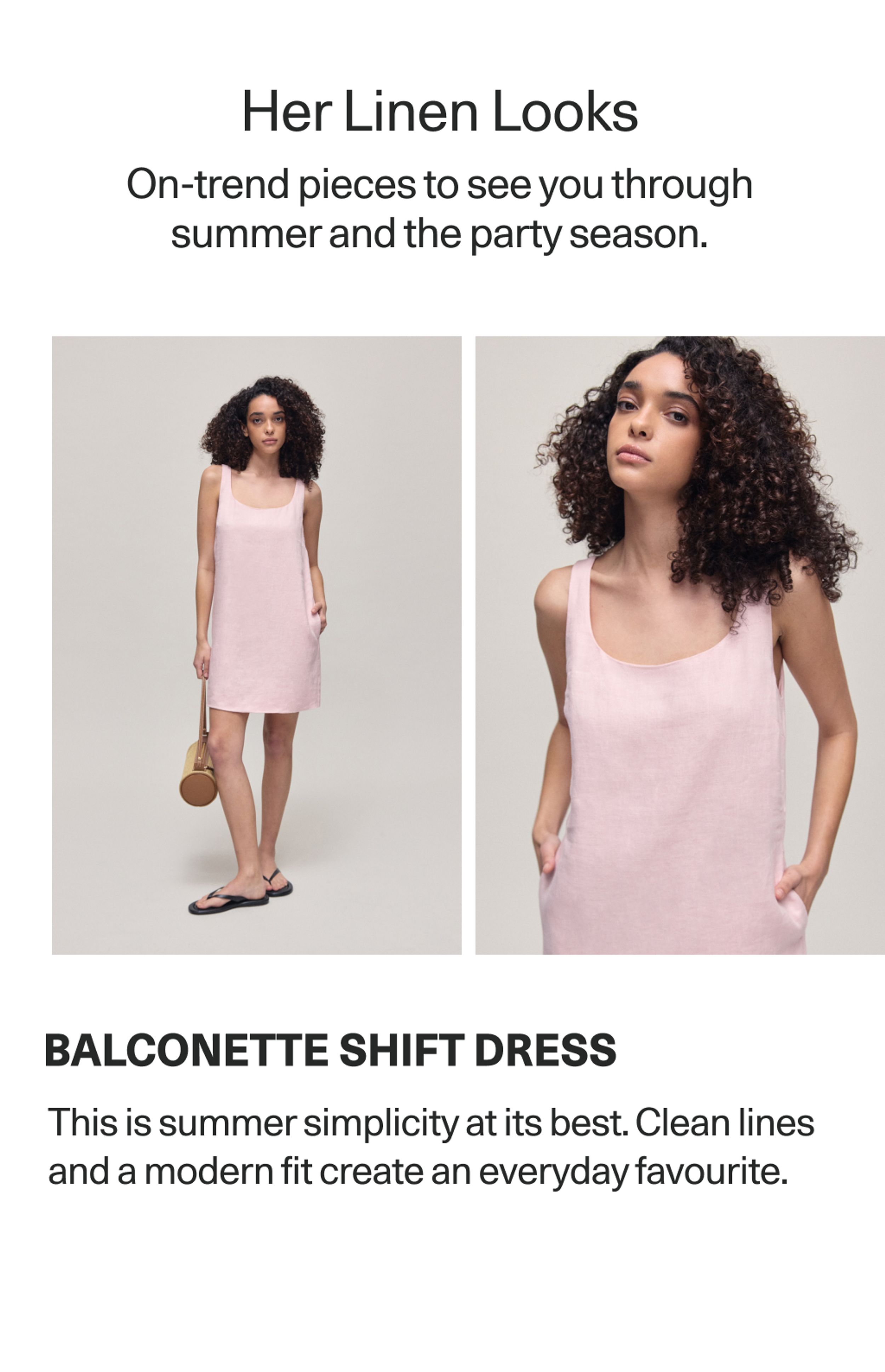 Bold cuts, fresh fits, and new ways to wear it. We’re looking at linen through a modern lens. Once reserved for classic summer staples, linen is more than just ‘easy breezy’ — think crisp tailoring, on-trend shift dresses and A-line maxis. Celebrity stylist Tori Knowles gives us her take on some of the trending linen looks from our newest collection. Effortless yet unexpectedly elevated, it’s time to see linen in a whole new light.